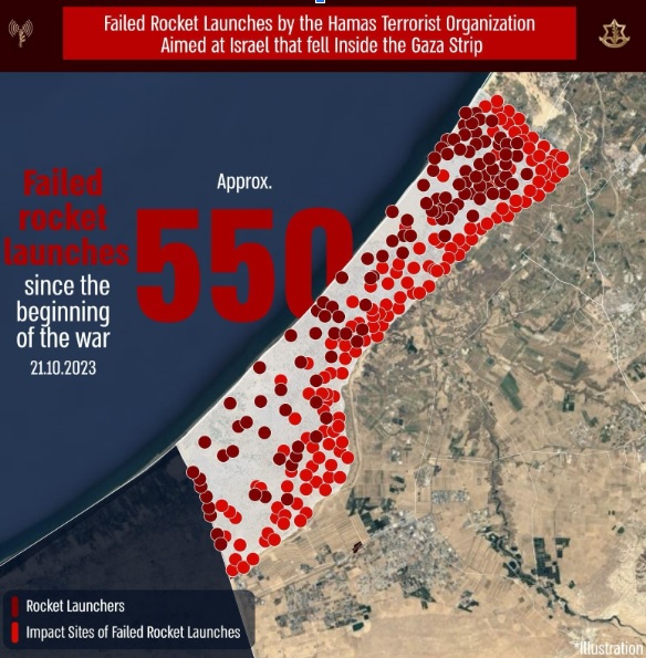 “The Hamas terrorist organization uses the residents of the Gaza Strip as human shields, and launches rockets from civilian infrastructure, areas and buildings in the Gaza Strip. Since the beginning of the war, the IDF has identified about 550 failed launches fired by Hamas that landed inside the Gaza Strip.”